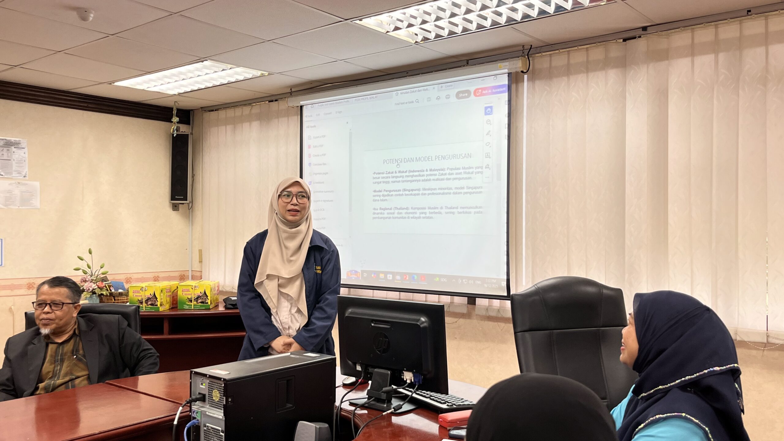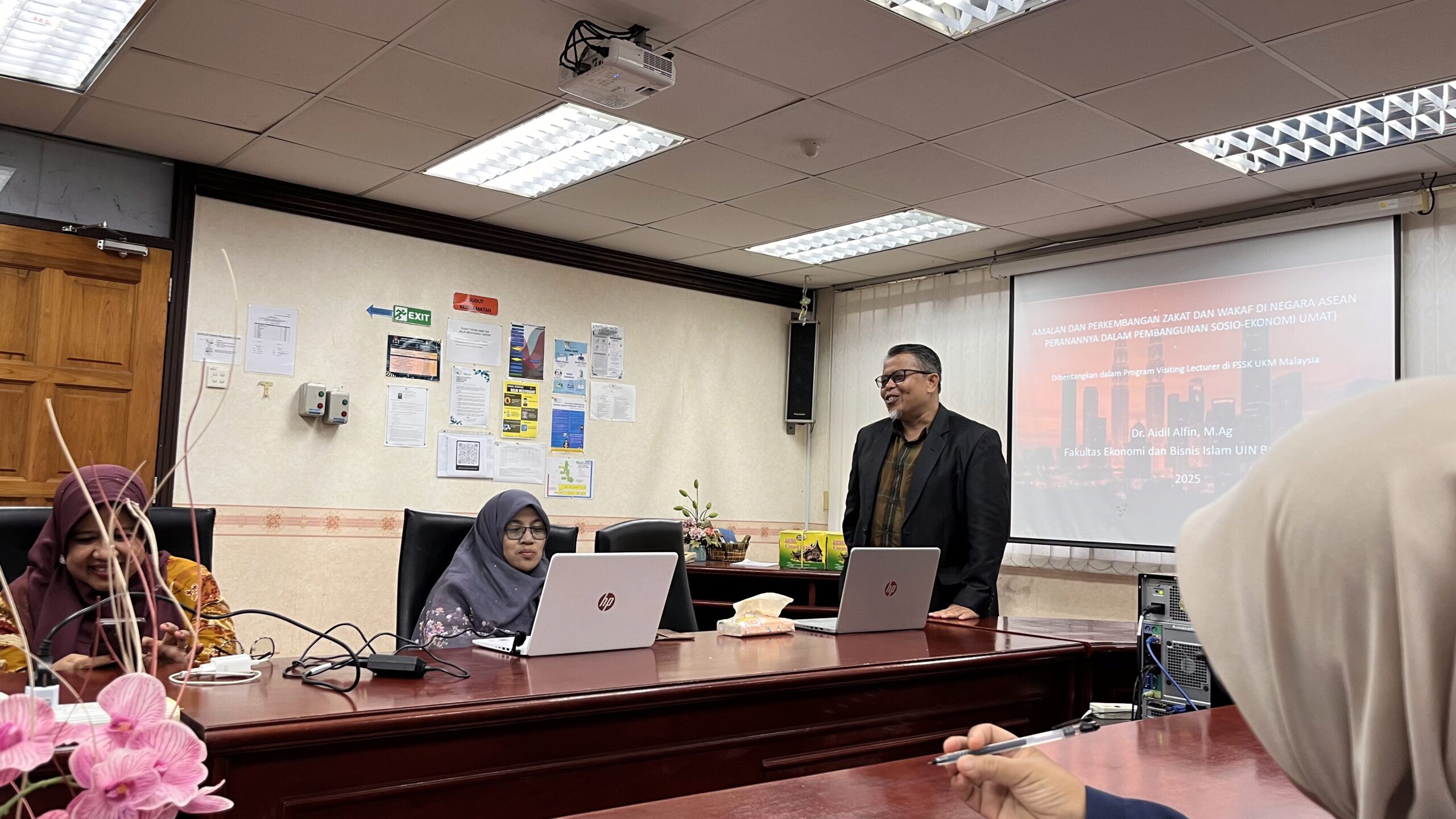 Dalam rangkaian kegiatan ini, ketiga dosen FEBI UIN Bukittinggi tidak hanya hadir sebagai peneliti, tetapi juga memberikan kuliah langsung di dalam kelas kepada mahasiswa FSSK UKM sebagai bagian dari program Visiting Lecturer. Kehadiran mereka memberikan perspektif baru bagi mahasiswa Malaysia mengenai dinamika ekonomi syariah dan sosial dari sudut pandang akademisi Indonesia. Selain mengajar, para dosen juga memaparkan hasil riset mendalam di forum ilmiah: Assoc. Prof. Aidil Alfin mempresentasikan dua makalah penting: hasil penelitian terkait tata kelola Zakat dan hasil pengabdian masyarakat mengenai manajemen tanggap darurat bencana Gunung Merapi. Prof. Dr. Rusyaida memaparkan karakteristik pariwisata di Sumatera Barat, menonjolkan potensi ekonomi daerah yang berbasis kearifan lokal. Dr. Dewi Sandra membedah peran Perbankan Syariah dalam strategi pengentasan kemiskinan, memperkuat diskusi mengenai inklusi keuangan syariah.