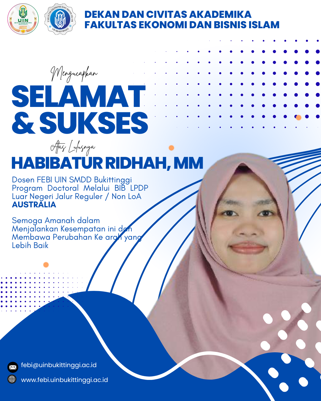 KETUA PRODI MHU FEBI UIN BUKITTINGGI, HABIBATUR RIDHAH, LOLOS BEASISWA LPDP DOKTORAL DI AUSTRALIA Bukittinggi – Kabar gembira datang dari Fakultas Ekonomi dan Bisnis Islam (FEBI) UIN Sjech M. Djamil Djambek Bukittinggi. Ibu Habibatur Ridhah, MM, yang menjabat sebagai Ketua Program Studi Manajemen Haji dan Umrah (MHU), berhasil lolos seleksi beasiswa Pendidikan Indonesia (BIB) Lembaga...Read More